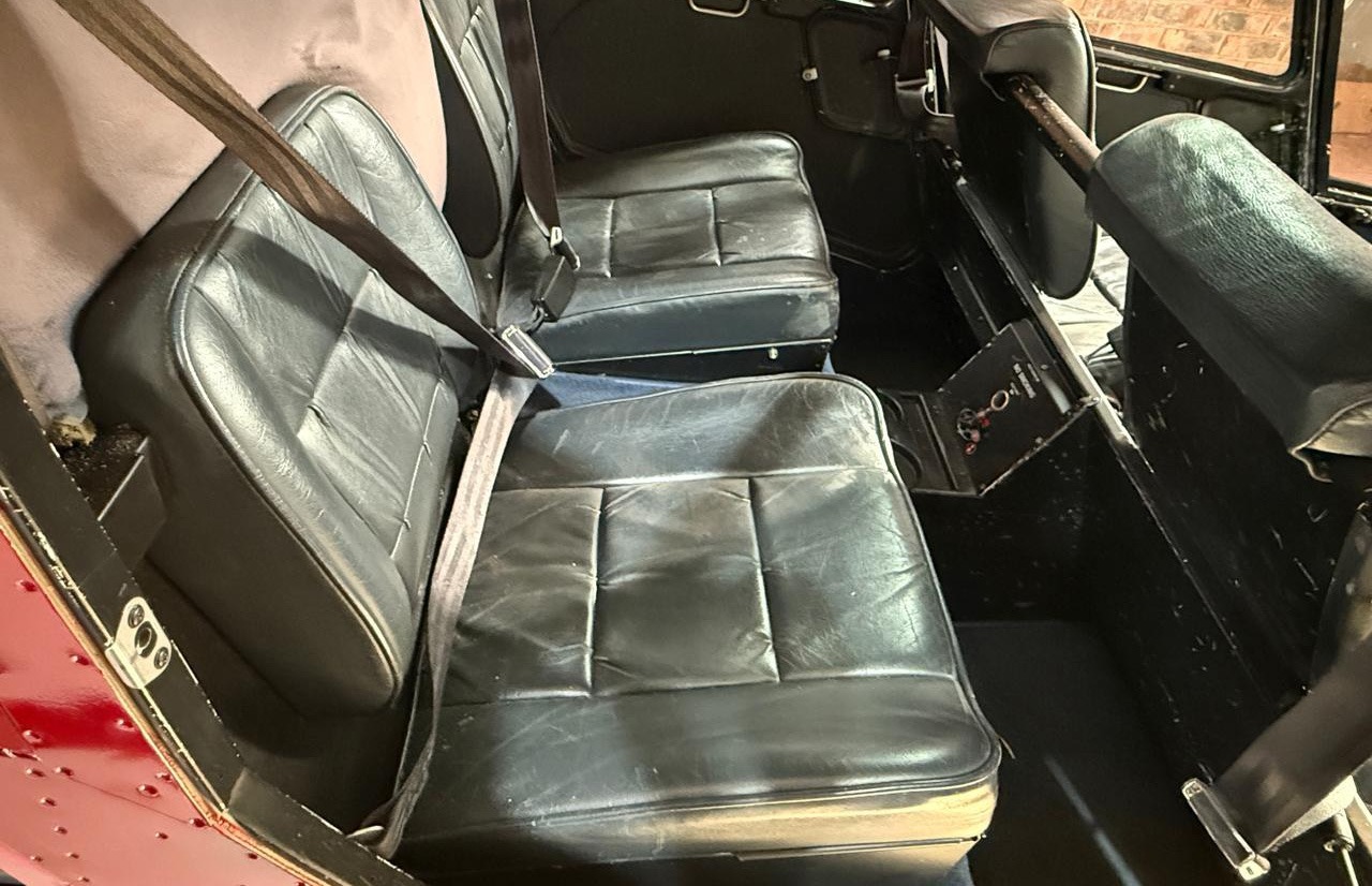 4 Seater, Red with white trim, dark grey leather seats and dark grey carpets.
